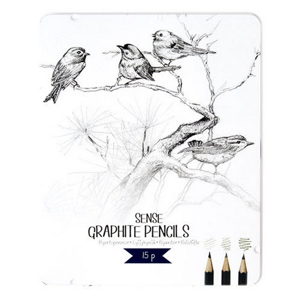 15 pennor i plåtask. Hårdheter mellan 9B-4H, för att ha allt från de mjuka till hårda pennorna.