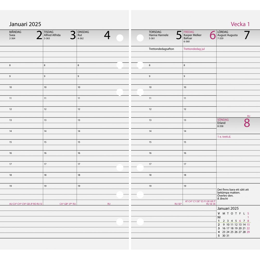 Aplan Diary Manager refill på 9,2 x 16,8 cm som är hålad för ringmekanism. Den innehåller 1 vecka per uppslag i 18 månader.