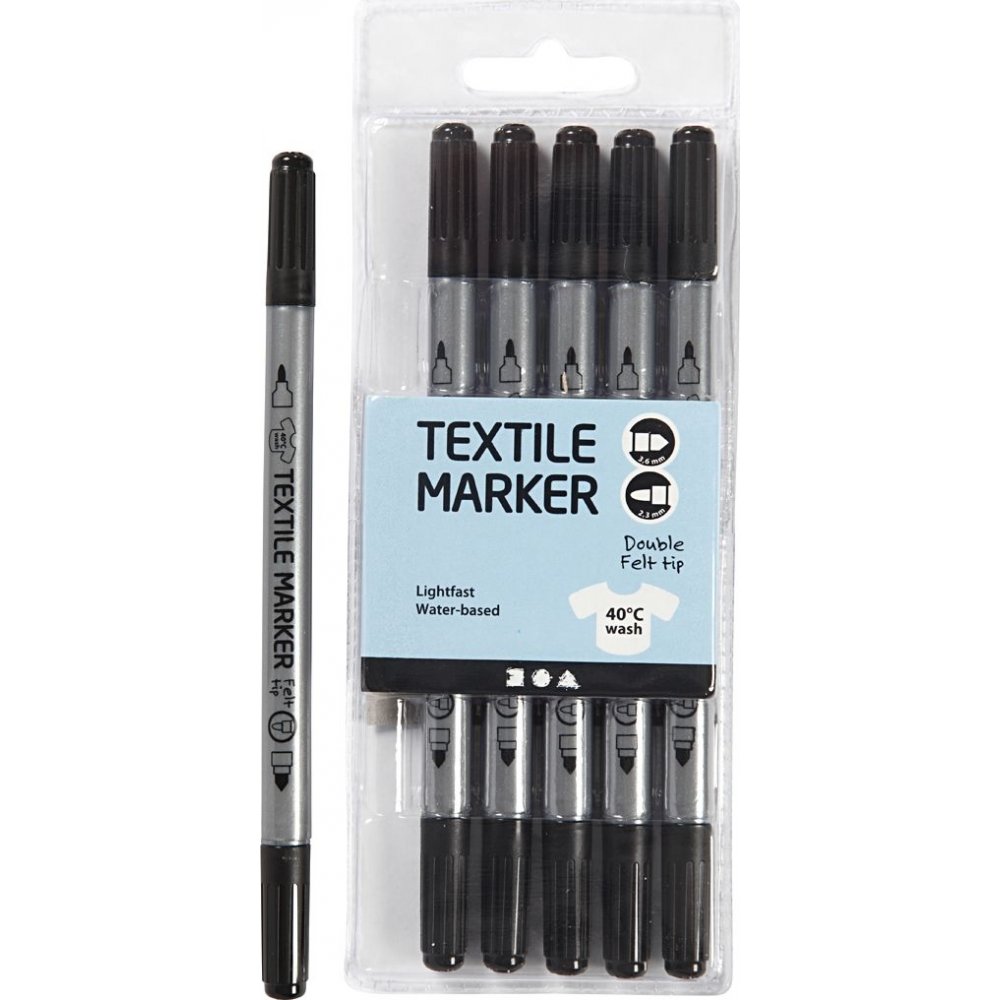 Permanenta textiltuschpennor med dubbel spets för dekoration av nya och gamla textilier. Skaka märkpennan väl före användning och lägg en bit plast eller papp inuti, t. ex. t-shirts och tote bags så att färgen inte tränger igenom och färgar av sig på andra sidan. När färgen har torkat fixerar du den genom att lägga ett bakplåtspapper över konstverket och sedan stryka fast det både ovanifrån och underifrån genom bakplåtspappret. Efter strykning håller färgerna sig vackra även när vid tvätt i 40C. Observera att textiltuschpennan är perfekt för ljusa bomullstextilier osv. Textiltuschpennor är perfekta för alla kreativa själar. Du kan använda dem för att ge liv åt alla typer av tyger med unika mönster och söta teckningar och löpa amok i färg! Tuschpennorna gör därför garanterat succé hos alla människor i alla åldrar, från konstnärliga vuxna till kreativa barn. Vill du kunna göra tunna linjer för att rita och skriva eller tjocka för att färglägga Med våra textiltuschpennor från Colortime har du båda alternativen. Vill du ha något som är enkelt att dekorera textil och tyg med är denna populära tuschpenna ett bra val.
