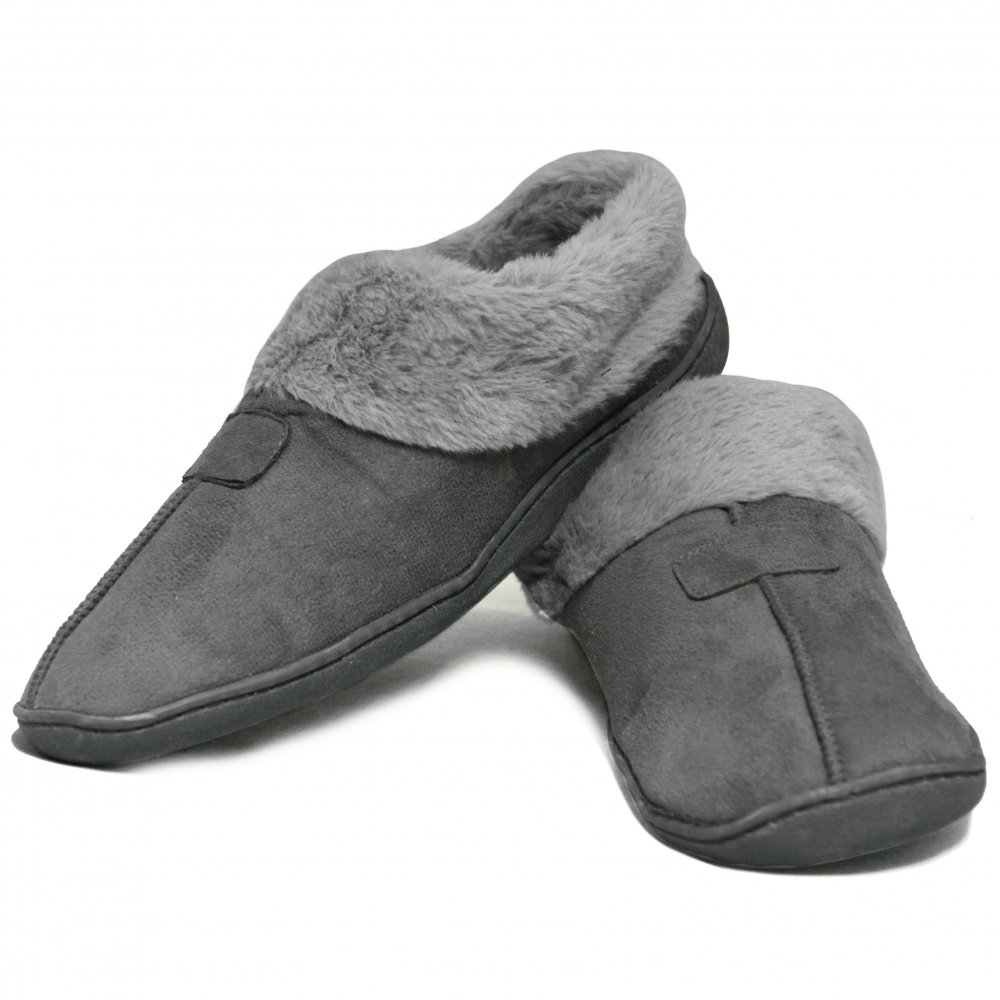 Innetofflor i mockaimitation- och pälsimitation för dam med varmt innerfoder med bred pälskant.