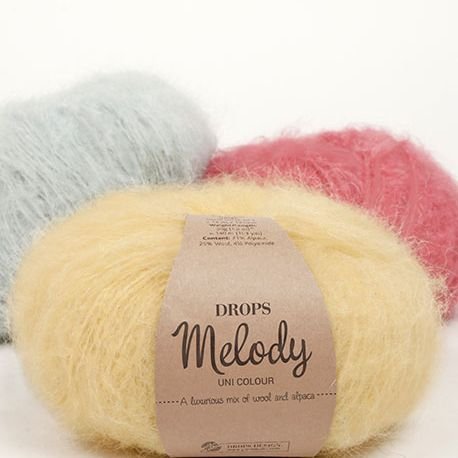 DROPS Melody är ett mjukt och lyxigt garn av superfin alpaca och merinoull. Det är varmt, ger en mohaireffekt och kommer i sofistikerade färger från ljus beige och gråa toner till härligt rött och lila. Ett bra val till mönster i Garngrupp D och det passar utmärkt till design gjord i garnet DROPS Vienna (som nu har utgått).