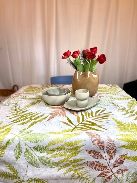 Vaxduk med blad i olika färger som ger en livfull och dekorativ dukning. Växtmotivet skapar en naturlig känsla på bordet och passar bra i kök, matsal eller på uteplats.