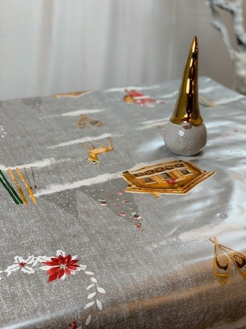 Vaxduk med julmotiv på silverfärgad botten som skapar en festlig och stämningsfull dukning under advent och jul. Den ljusa silverbakgrunden tillsammans med julmönstret ger bordet ett dekorativt uttryck som passar bra vid både julmiddagar och fika.