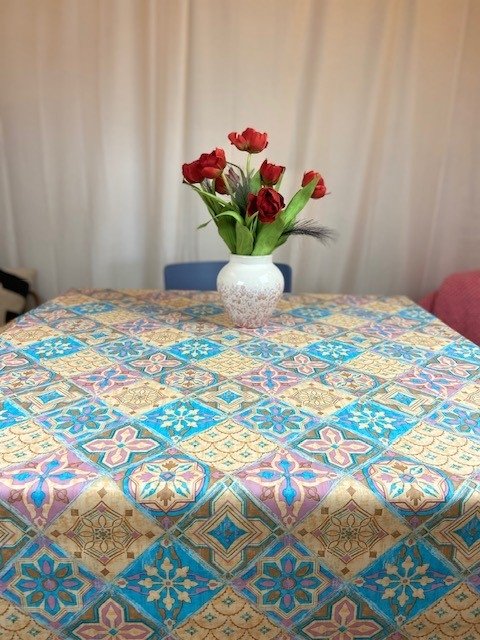 Vaxduk med kakelmönster inspirerat av klassiskt grekiskt kakel. Det dekorativa mönstret ger bordet ett tydligt och stilrent uttryck och passar bra i både kök, matsal och på uteplats.