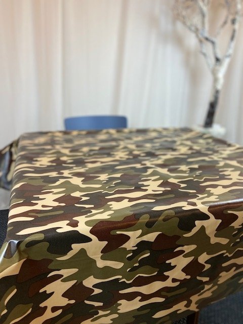 Vaxduk med kamouflagemönster som ger ett tufft och annorlunda uttryck till dukningen. Mönstret passar bra både i kök, hobbyrum och på uteplats där du vill ha en mer rustik stil.
