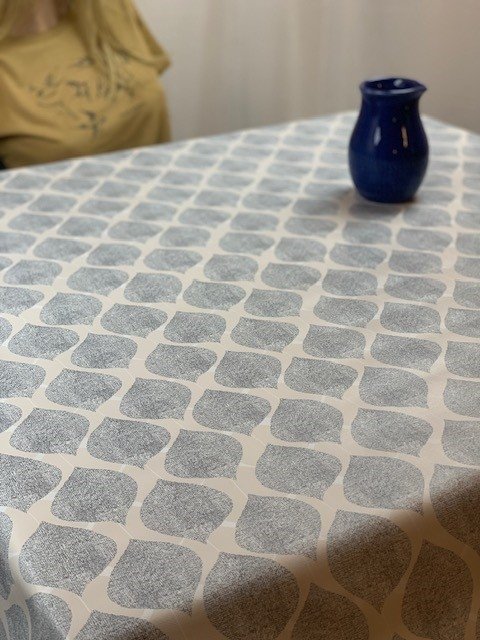 Vaxduk med mörkblått droppmönster i ellipsform som ger en dekorativ och grafisk känsla till dukningen. Mönstret skapar ett levande uttryck och passar bra i både kök, matsal och på uteplats.