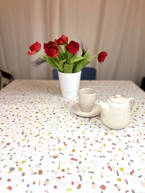 Vaxduk med mosaikmönster på vit botten som ger en dekorativ och livfull dukning. Det grafiska mönstret skapar ett tydligt uttryck på bordet och passar bra i både kök, matsal och på uteplats.