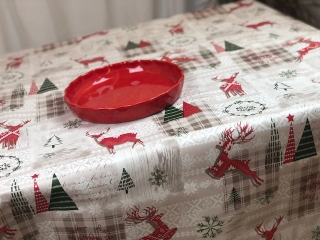 Vaxduk med motiv av renar och granar som skapar en stämningsfull och vinterinspirerad dukning. Det traditionella mönstret passar bra under advent och jul och bidrar till en varm känsla runt bordet.