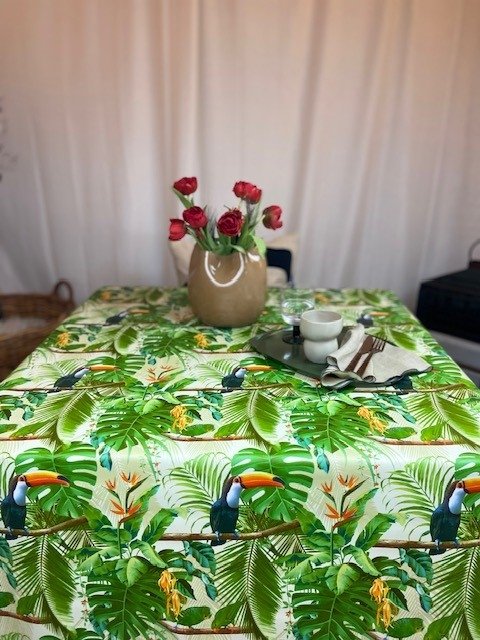 Vaxduk med motiv av en tucan i djungelmiljö som ger en färgstark och tropisk känsla till dukningen. Det exotiska mönstret passar bra i både kök, matsal och på uteplats och skapar en somrig atmosfär runt bordet.
