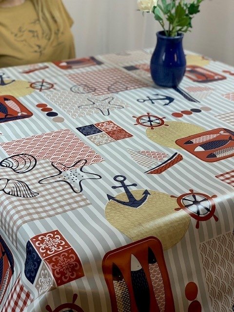 Vaxduk med sjötema inspirerat av västkusten i röd färg som ger en maritim och dekorativ dukning. Motivet passar bra i både kök, matsal och på uteplats och skapar en tydlig kustkänsla runt bordet.